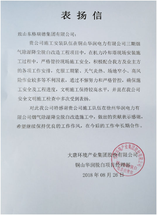 山东格瑞德集团有限公司为徐州华润电力有限公司安装节能型钢结构却塔,在徐州华润电力有限公司工程中,山东格瑞德集团有限公司全程参与施工过程。格瑞德一直秉承着“质量管理零失误、产品质量零缺陷”的理念,在产品制造上精益求精。此次为徐州华润电力有限公司安装大型钢结构却塔,能够充分有效地冷却设备,保障发电设备高效稳定地运行。