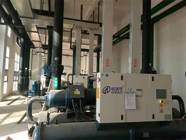 2、水冷螺杆机组适用于大型制冷量需求的建筑,能效比高,运行费用低,维护点少,检修简单,设立了独立机房不影响车间生产噪音干扰。