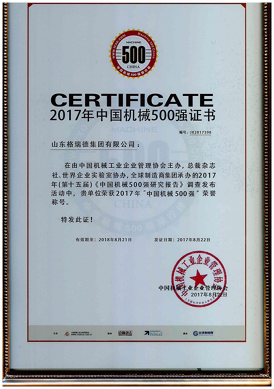 GRAD山东格瑞德集团有限公司入选2017年“中国机械500强”企业