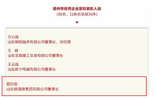 20多年来,在管印贵董事长的带领下,集团不断成长,不断发展,几经搬迁,几经变革,承载着许多人的事业和期望。通过在中央空调领域和复合材料领域不断耕耘拓宽,形成了清晰的产业发展路径。未来的格瑞德集团,将围绕空调工程、复合材料、通风人防、环保工程四大板块,充分结合“互联网+”和《中国制造2025》的国家行动纲领,努力打造一个全新发展的格瑞德创新生态圈。因此,经市委、市政府和表彰工作领导小组严格审核,集团董事长管印贵历经层层审批成功入选德州市50名优秀企业家。
