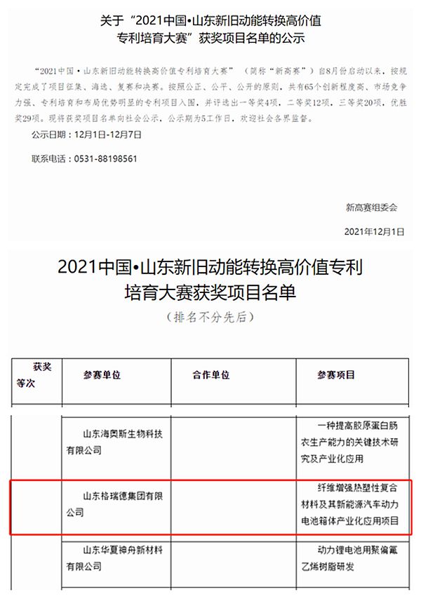 8月,“2021中国·山东新旧动能转换高价值专利培育大赛”正式拉开帷幕,经过多轮角逐,格瑞德集团提报的“纤维增强热塑性复合材料及其新能源汽车动力电池箱体产业化应用项目”荣获大赛优胜奖。