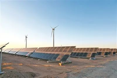 当新能源遇见演兵场,大漠“风光”无限。蓝天白云下,无垠大漠上,数台风机与成片太阳能发电板遥相呼应。