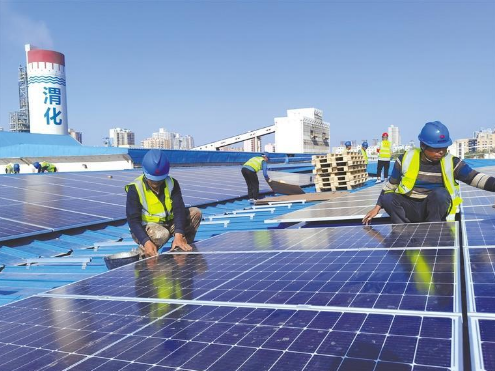 夏日里,在陕煤集团陕西渭河煤化工集团有限责任公司(以下简称渭化集团)尿素车间大棚屋顶上,一排排光伏发电板在阳光下泛着耀眼的光,犹如一片蓝色海洋。施工人员正在加紧建设,他们将利用公司的尿素车间大棚屋顶建设近2万平方米的光伏项目。