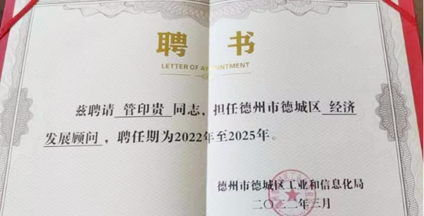 格瑞德集团在董事长管印贵同志的带领下,不断加强观念创新、制度创新、管理创新和技术创新,广泛吸收国内外先进技术和管理成果,取得了骄人的成绩。为弘扬企业家精神,德州市德城区工业和信息化局授予董事长管印贵“德州市德城区经济发展顾问”荣誉称号。