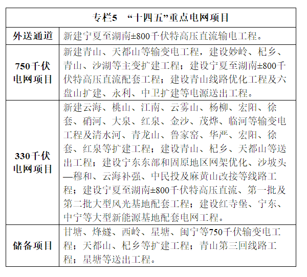 1.打造“西电东送”网架枢纽。充分发挥电网在能源生产清洁化和能源消费电气化中的关键枢纽、重要平台、绿能载体作用,打造电网服务新能源高质量就地消纳和大范围优化配置的“双样板”,加快建设清洁低碳、安全高效、智慧共享、坚强送端的现代一流电网,建成绿能外送大通道、绿能配置骨干网、绿能利用大平台,全力构建宁夏新型电力系统。建成以输送新能源为主的宁夏至湖南±800千伏特高压直流输电工程,建成750千伏青山、天都山等重点工程,构建覆盖全境、结构坚强、布局合理的宁夏750千伏骨干网架。到2025年,力争直流电力外送能力提升至2200万千瓦,建成内外互达、多能互补、区域互济的“西电东送”网架枢纽。