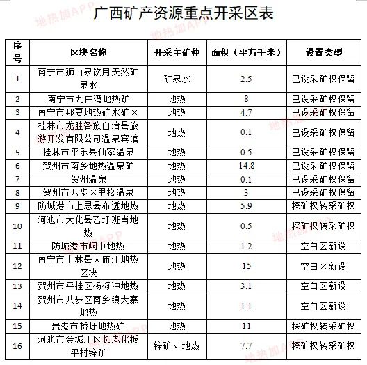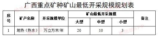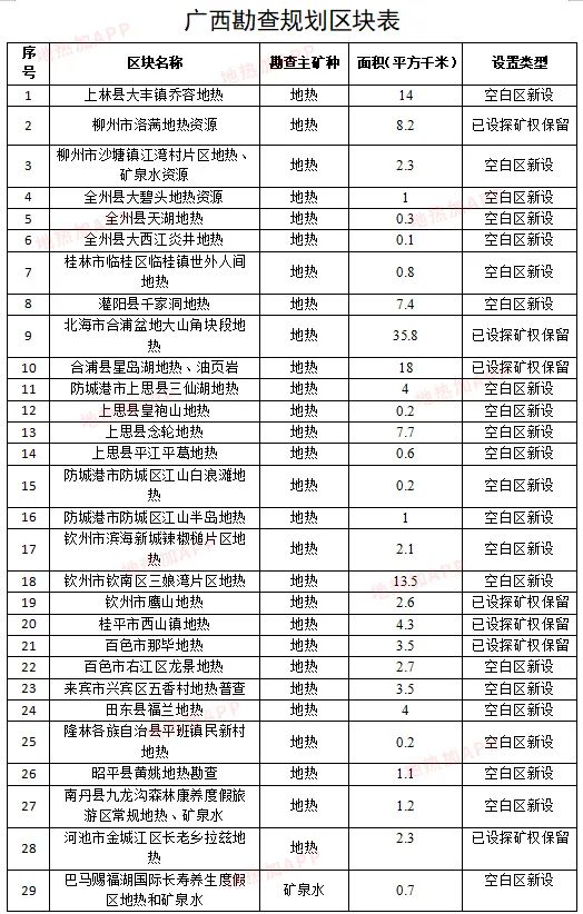 最后,《规划》以附件形式发布了广西矿产资源重点勘查区表、广西勘查规划区块表、广西矿产资源重点开采区表、广西重点矿种矿山最低开采规模规划表,对广西矿产资源区块进行了详细的统计与划分,其中涉及大量的地热田资源。