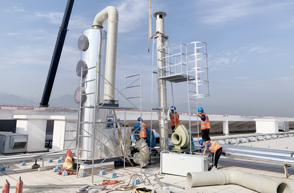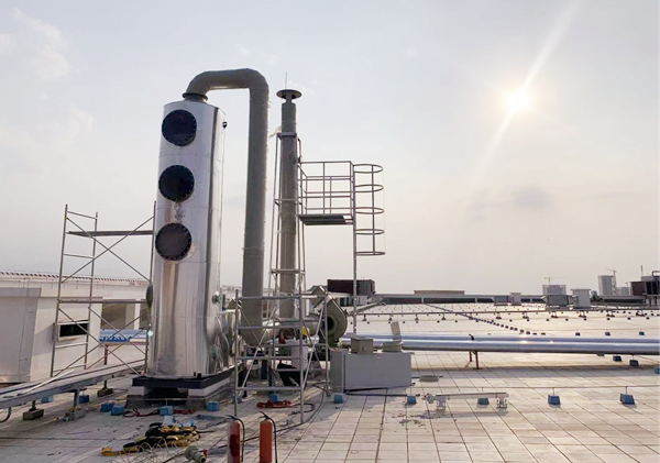 该项目为处理实验过程中挥发的酸性废气,经过喷淋塔设备处理后达标排放。该项目为系统工程承揽,系统中所含喷淋塔、风机、管道、电控、烟囱爬梯检测平台及烟囱支架等全部由格瑞德集团进行生产加工。