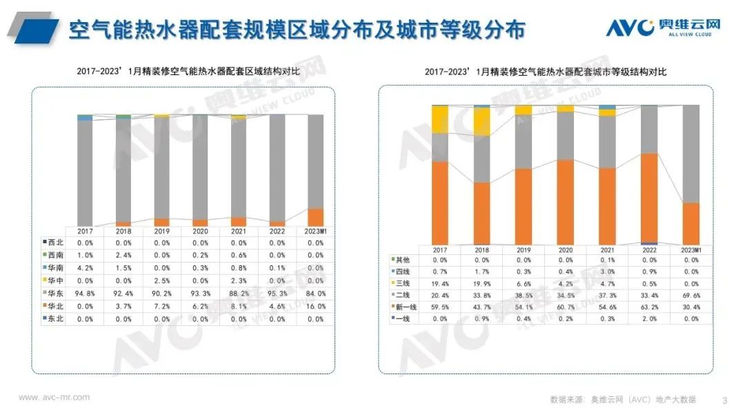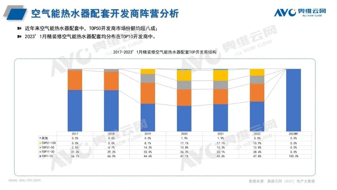 从近年空气能热水器市场来看,近年来空气能热水器主力战场始终是华东区。从近年城市等级分布来看,空气能热水器集中分布在新一线城市和二线城市中,合计份额均在七成以上,从单个城市来看,近年来空气能热水器重点城市主要为杭州,宁波、绍兴、温州等,从开发商阵营来看,近年来空气能热水器配套中,TOP50开发商市场份额均超八成,其中TOP10开发商市场份额均为40%以上, 2023年1月精装修市场空气能热水器配套均分布在TOP10开发商中。