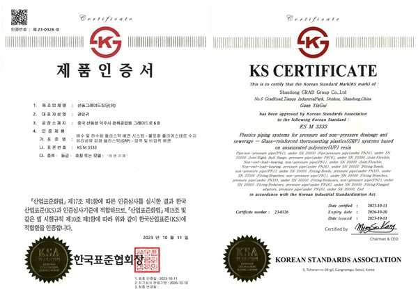 2023年10月11日,格瑞德集团获得韩国工业标准协会颁发的韩国KS产品认证证书。韩国KS认证是指对能够持续、稳定生产韩国工业标准以上产品的企业,进行严格的审核,使其能够加贴KS标志的国家认证制度,通过KS认证证明格瑞德生产的玻璃钢管道完全符合韩国标准,使产品在进入国际市场时更容易被市场所接受,更具竞争力,对提高公司在国际市场的品牌声誉有很大的推动作用。目前,中国玻璃钢管道产品,格瑞德是第一家取得韩国KS产品认证的公司。