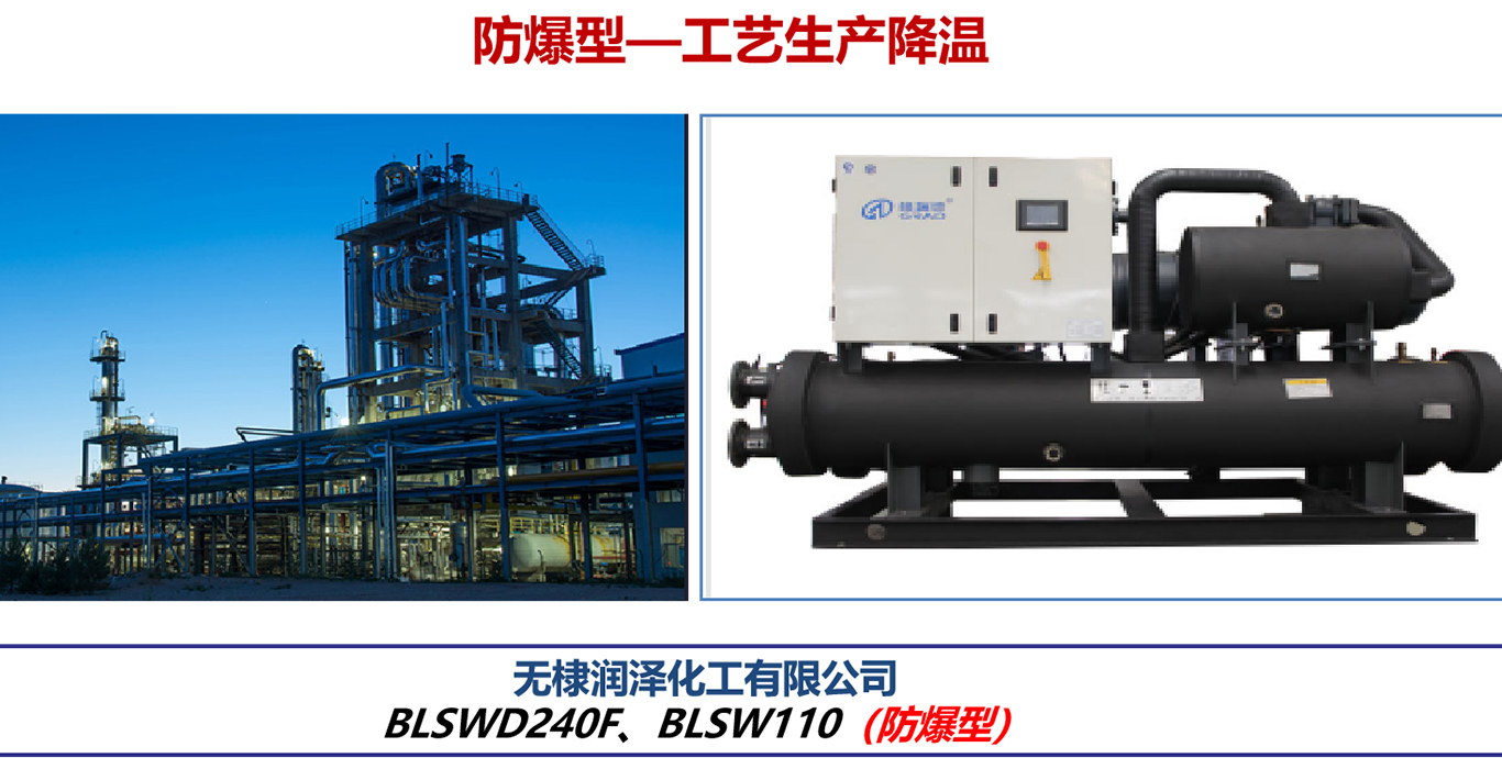 低温防爆机组冷冻水载冷剂为质量溶度55%的乙二醇溶液,使用侧出水温度低至-30℃,可以提供稳定的工艺冷水;同时采用多项专利技术,保证机组稳定运行。