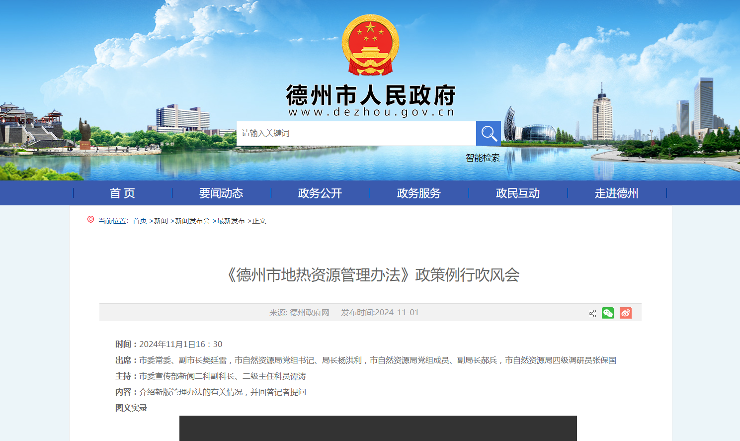 近日,德州市举办《德州市地热资源管理办法》政策例行吹风会,德州市委常委、副市长樊廷雷就新版管理办法的有关情况做介绍。据介绍,德州是地热资源富集区,目前已查明地热资源量约500亿立方米,占全省的21.35%。地热井成井深度1300—1700米,地热水出水温度52—70℃。已探明全市范围内均有地热资源分布,回灌条件下年可采量约5亿立方米,可供暖面积6亿平方米。近年来,德州市抢抓政策机遇,加大地热资源开发利用力度,在技术研发、装备制造、矿业权出让管理等方面积极探索、持续发力,形成了地热资源开发利用的“德州模式”。