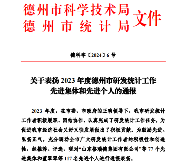 2月,德州市科学技术局、德州市统计局联合召开2024年度德州市研发统计工作会议。会议公示表扬了2023年度研发统计工作先进集体和先进个人。格瑞德集团凭借卓越的研发创新实力,成功荣获“研发统计工作先进集体”称号。