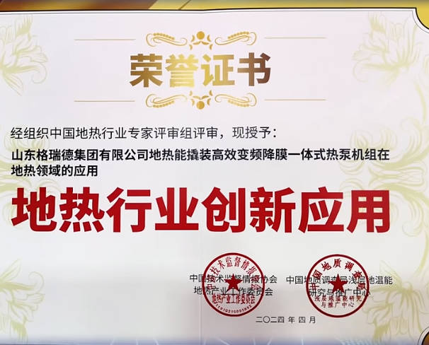 4月,格瑞德集团受邀参加2024四川(成都)地热高质量发展大会,会上集团凭借地热能撬装高效变频降膜一体式热泵机组在地热领域的卓越应用,经过中国地热行业专家评审组的严格评审,荣获地热行业创新应用奖。