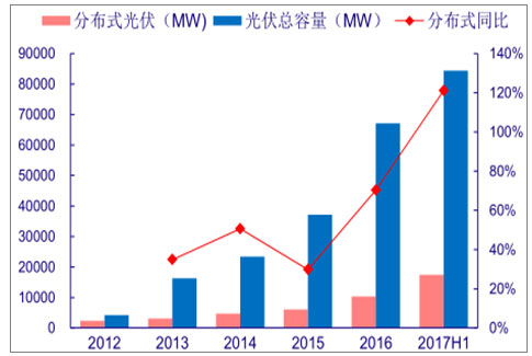 政策倾斜。根据《电力发展“十三五”规划》,到2020年太阳能发电装机达到110GW以上,其中分布式光伏60GW以上、光热发电5GW。能源局在发布的《太阳能发展“十三五”规划》中提出,到2020年建成100个分布式光伏应用示范区,园区内80%的新建建筑屋顶、50%的已有建筑屋顶将安装光伏发电,粗略估算分布式项目产值约万亿。为响应国家号召,多个省市地区纷纷颁布利好行业发展的补贴政策,2017年分布式光伏市场蓬勃发展,新产品、新模式、新业态层出不穷。
