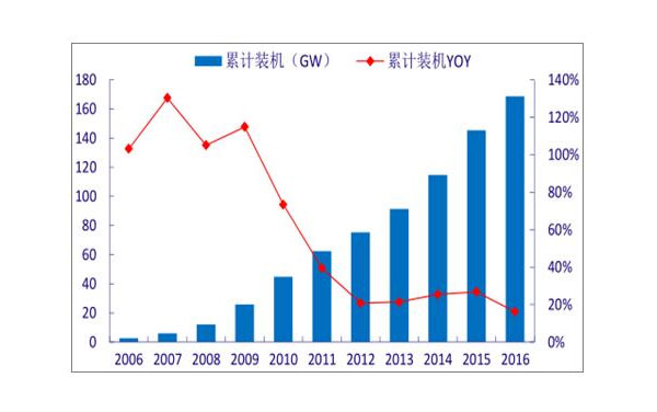 我国风电行业迅速成长。2006至2016年间,我国风电行业以年复合 52.14%的速度迅速成长。2010年装机规模首次超过美国。据统计,2016 年底中国累计风电装机已达到168.73GW,占全球比重高达34.48%。