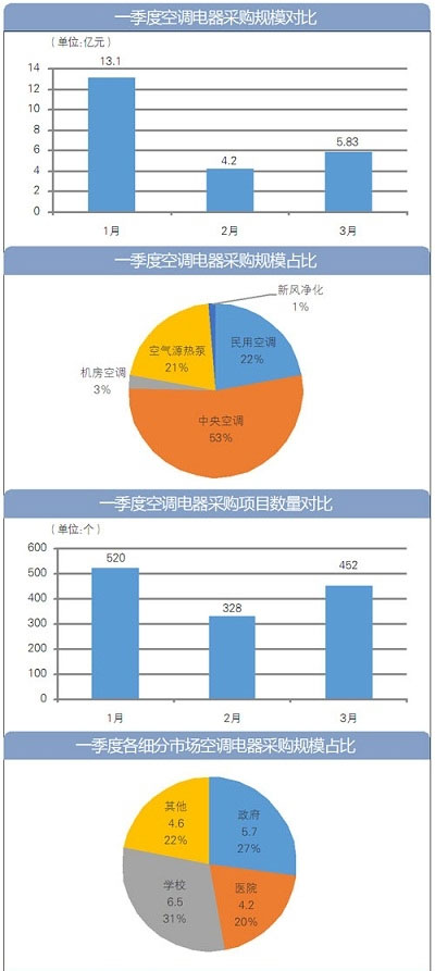 空调电器采购呈现向好态势。据《政府采购信息报》不完全统计,一季度,全国空调电器采购项目约1300个,采购总规模约23.1亿元,较去年同期增长35%。其中,1月采购项目数量和采购规模均位居首位。医院中央空调、学校煤改电以及民用空调批采成为三大主力。