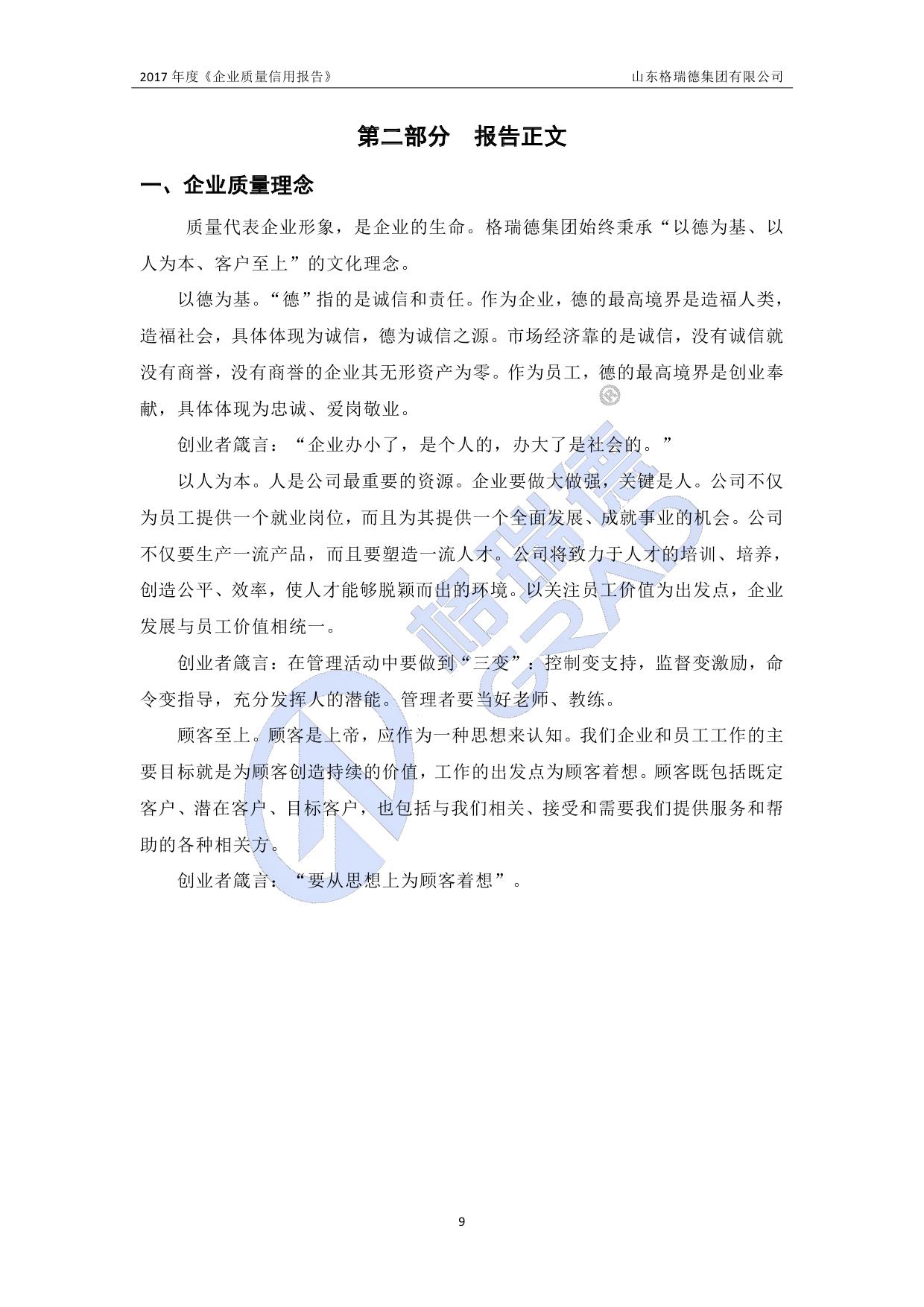 格瑞德集团和所有员工的价值观——以德为基,以人为本,顾客至上 格瑞德企业精神——凝聚自强,追求卓越 愿景:培育卓越人才,成就百年基业 使命:让人工环境更美好 发展方针:以市场为导向,以效益为中心,坚持内涵与外延并举,大力实施品牌战略、人才战略和创新战略,不断调整产品结构,提高技术含量,增强核心竞争力。 发展目标:坚持“整合、融合、共合、长合”产业思维,构建开放、共享、创新、发展的产业生态。