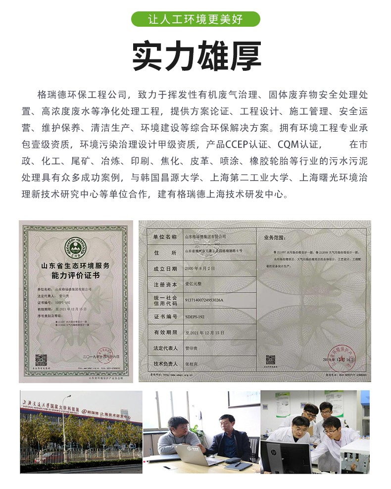 格瑞德集团致力于挥发性有机废气治理、固体废弃物安全处理处置、高浓度废水等净化处理工程,提供方案论证、工程设计、施工管理、安全运营、维护保养、清洁生产、环境建设等综合环保解决方案。